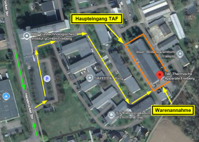 - Der Straße immer geradeaus folgen. Nach einer Linkskurve ist das Gebäude am TAF-Firmenlogo erkennbar