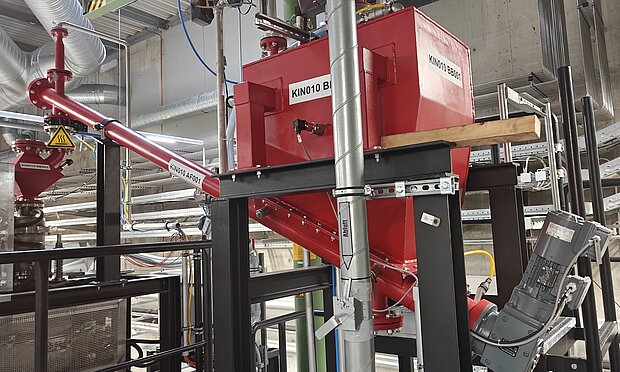 Über einen Vorlagebehälter erfolgt die Eintragung von torrefizierter Biomasse in einen Niedertemperaturvergaser. Der vordere Teil der Schnecke wird durch einen Doppelmantel gekühlt.