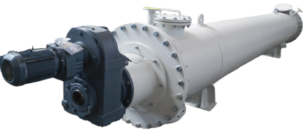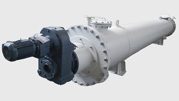 Mit vorgeschaltetem Dosierbehälter fördert die angeflanschte Schnecke in einen Festbettreaktor